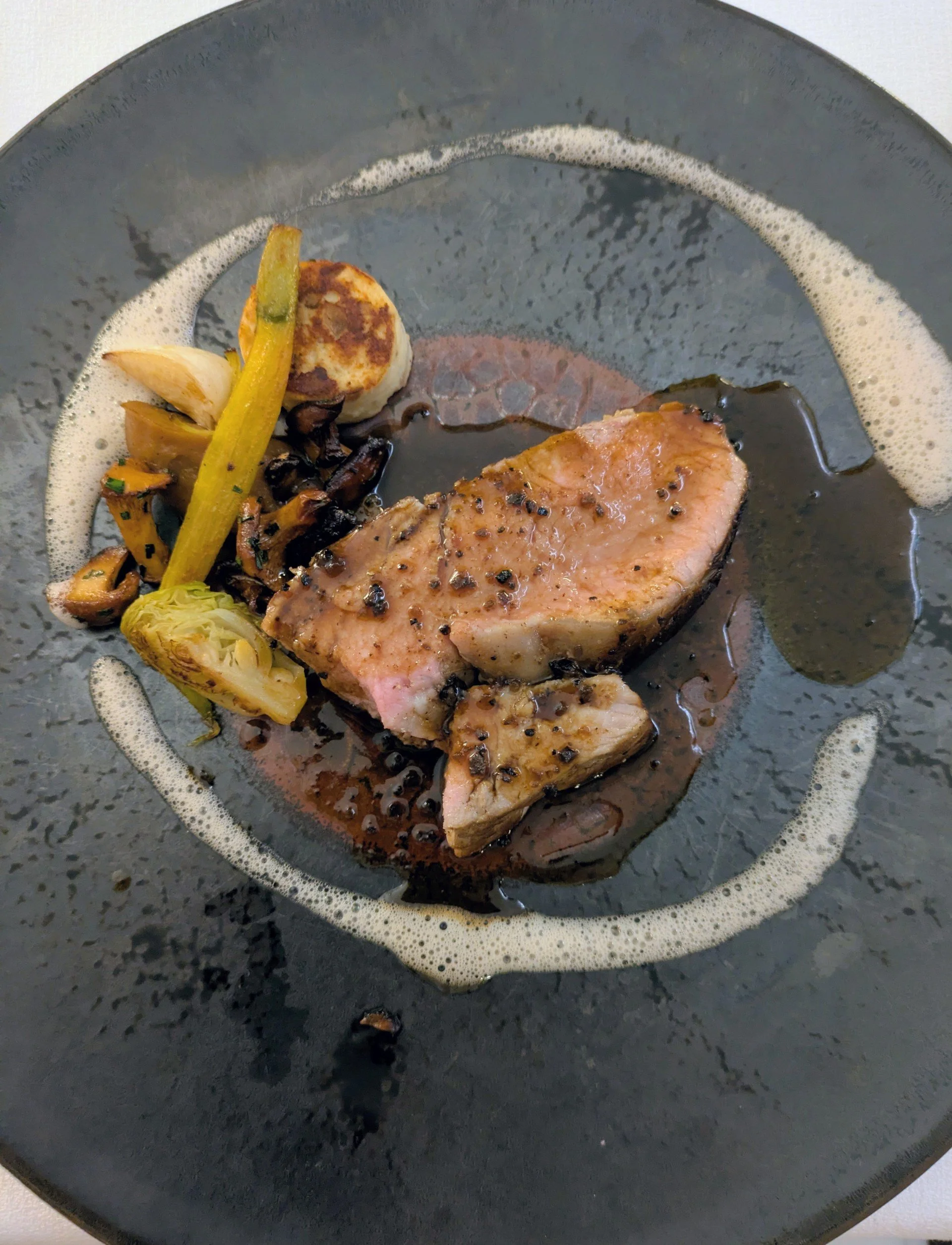 The courses kick off with a trip to the dense forests of the region; cep mushrooms appeared twice, and they were more than welcome each time. First, a delicate ravioli with a light cream that somehow managed to feel indulgent and restrained at the same time, and which burst with that musky, forest floor flavour that has made this particular mushroom a prized ingredient in kitchens across Europe. Their second appearance arrived raw and paired with a Comté foam so airy it barely seemed to exist, and yet left a powerful punch of flavour on the palate.
